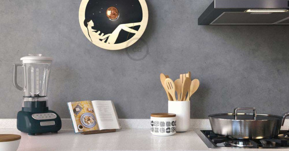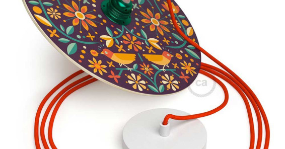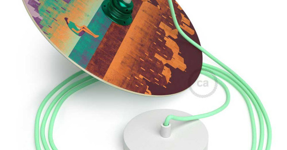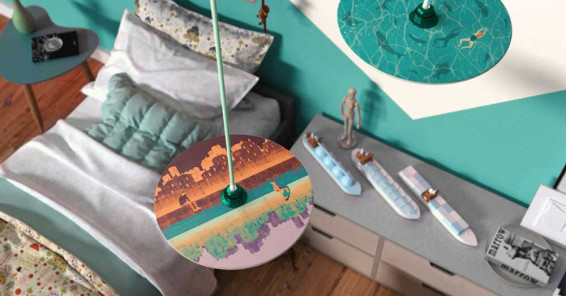 Le lampade UFO sono paralumi in legno con illustrazioni di grandi illustratori italiani.