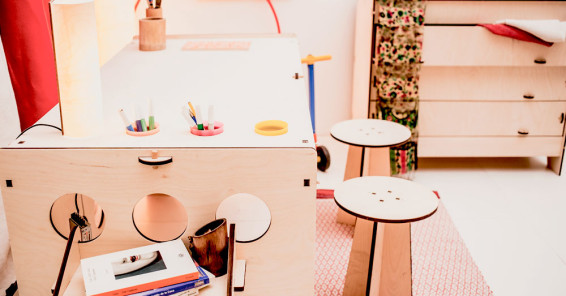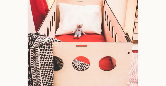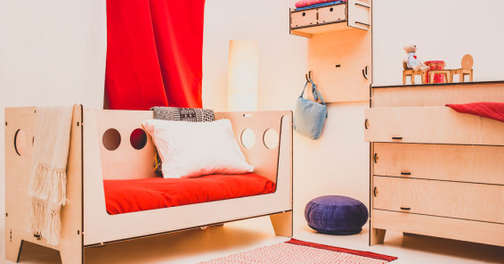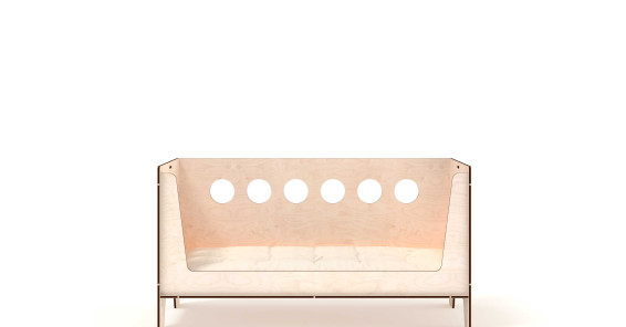 Lettino trasformabile in scrivania e divanetto in multistrato di betulla.