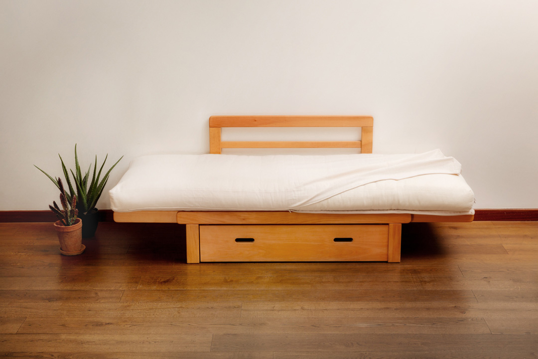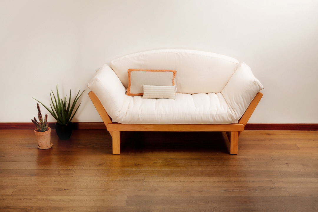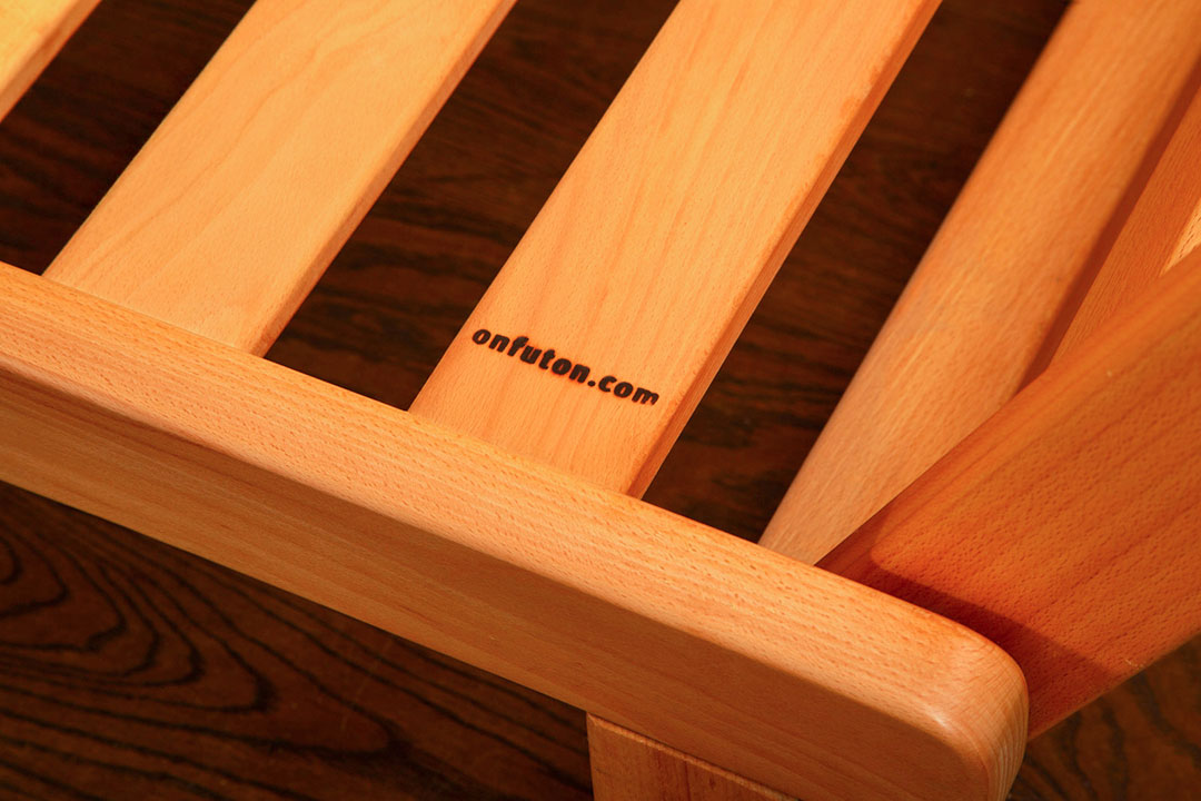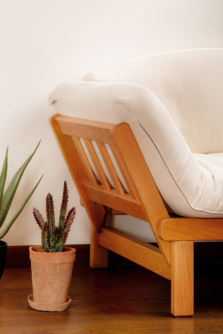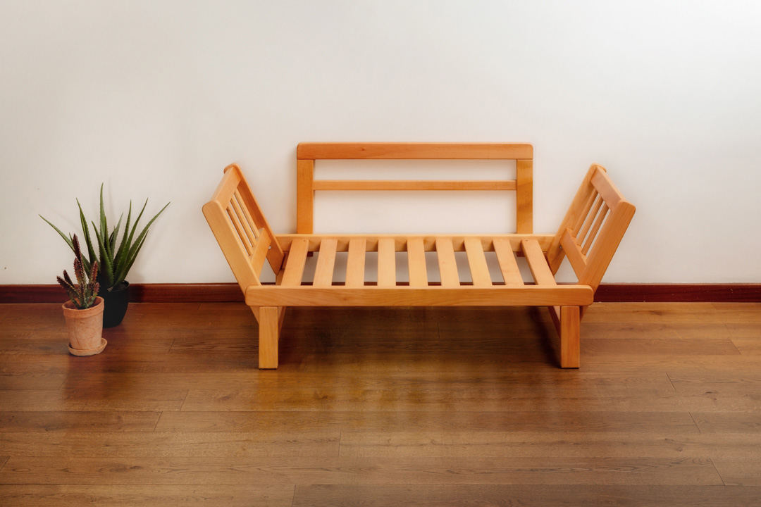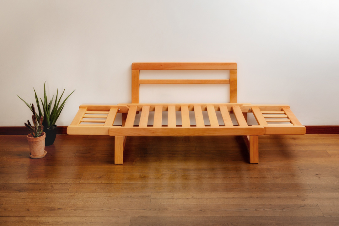 Legno massello di faggio evaporato, finito con oli vegetali e cera d’api.