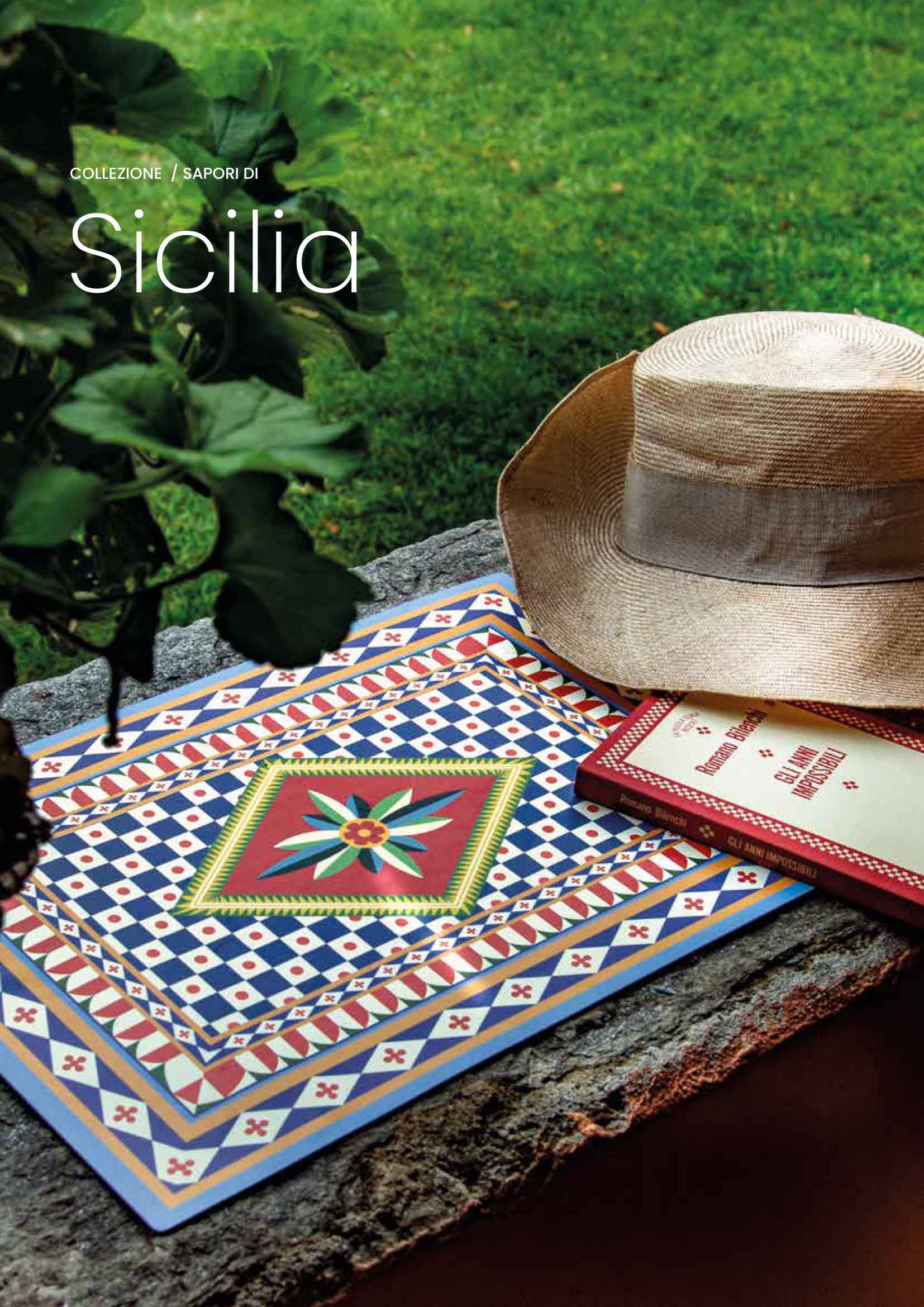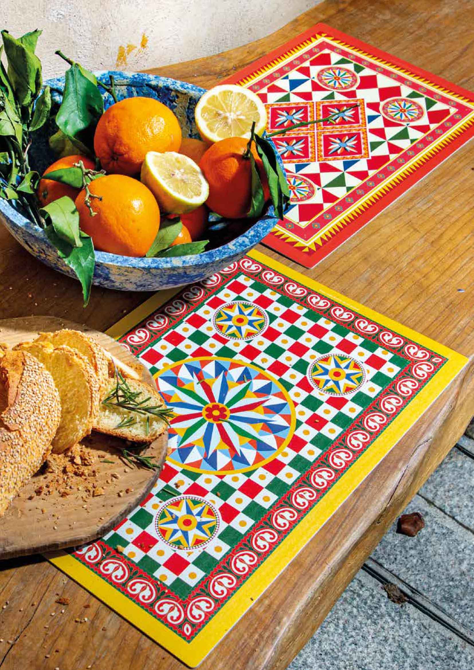 La collezione Sapori di Sicilia sfoggia una tavolozza di tinte accese accostate ai motivi decorativi tipici dell’iconografia folcloristica dell’isola, scelgono i colori giallo, verde, rosso e blu delle tipiche maioliche smaltate.